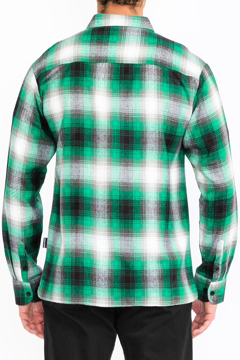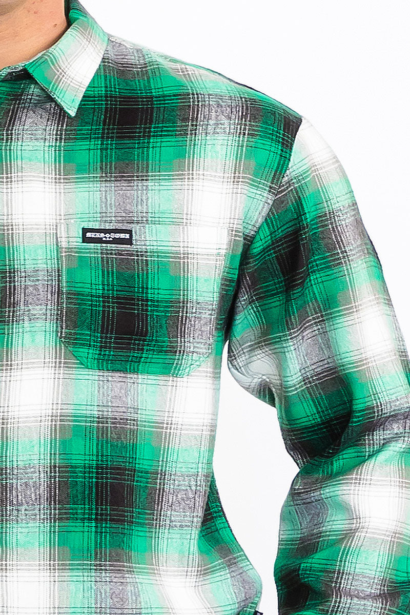 Button Up Closure with Single Chest Pocket. Company Logo along the right sleeve hem.